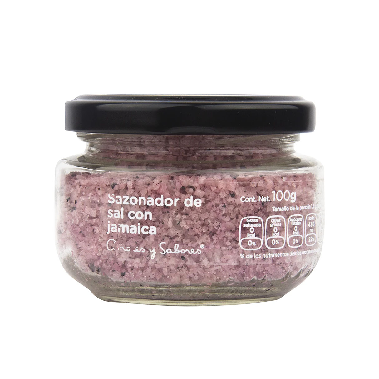 - Sal natural del mar de Colima, secada al sol, y combinada con flores de jamaica orgánica.