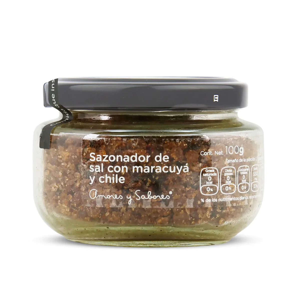 - Sal natural del mar de Colima, secada al sol, con saborcito ácido del maracuyá y chile de árbol.